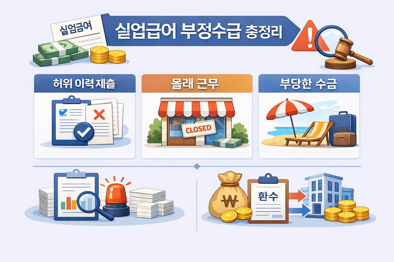 그런데 단순 실수로도 부정 수급이 될 수 있다는 거 알고 계셨어요? 문제는 환수 기준이 받은 금액의 5배 또는 형사처벌까지 가능하더라고요. 그래서 오늘은 실업급여 부정 수급관련해서 자세히 알아볼게요.